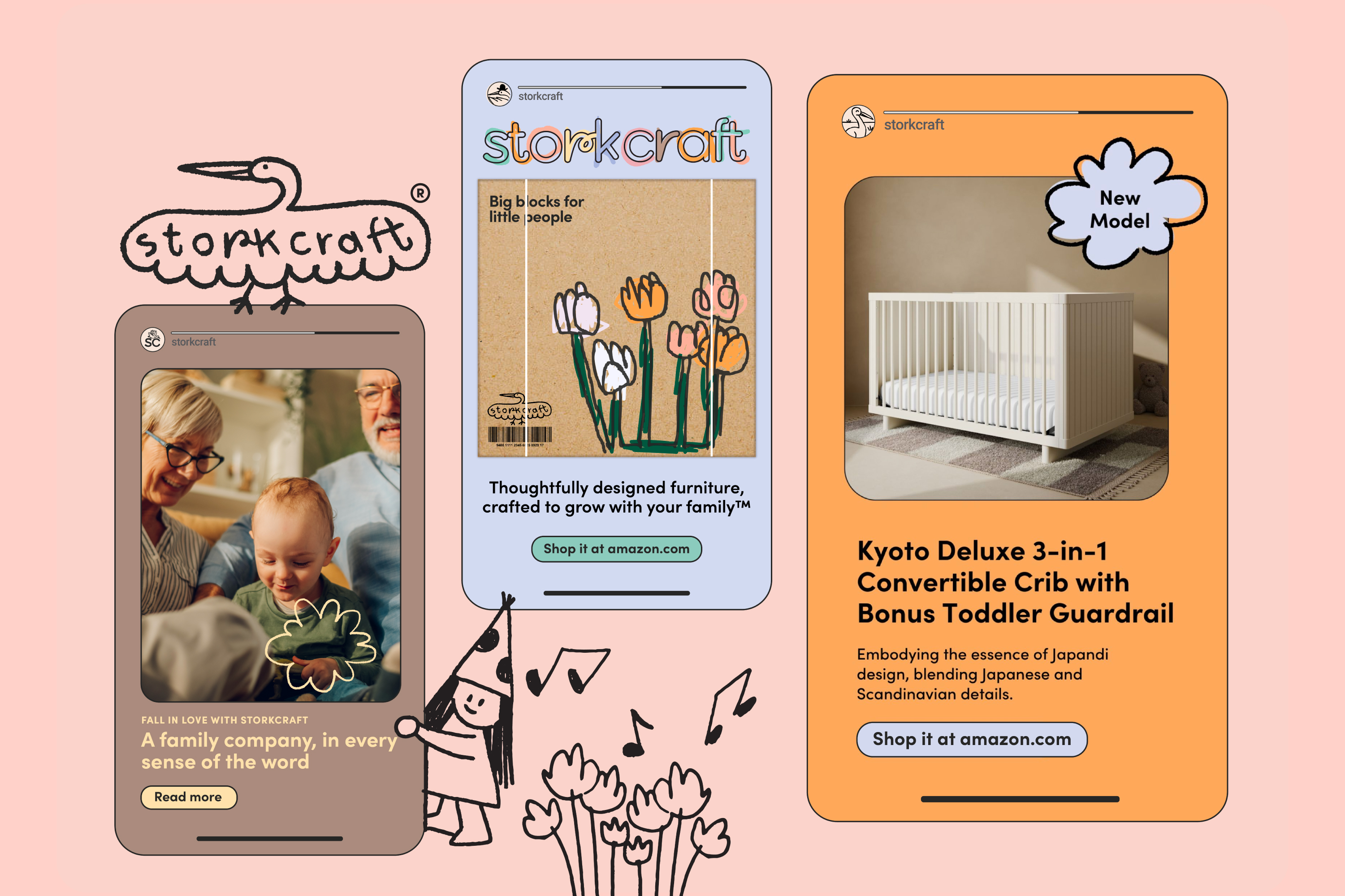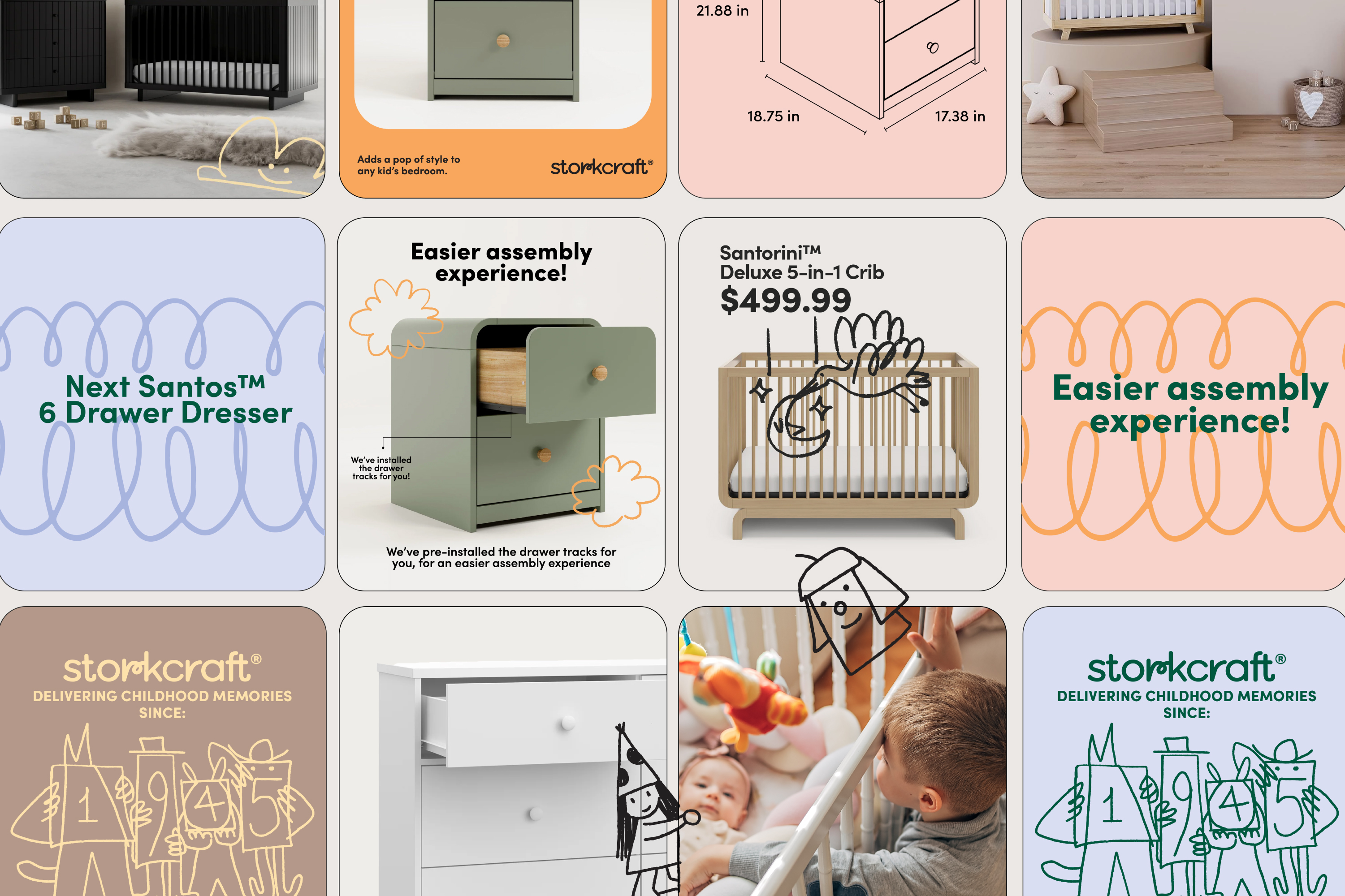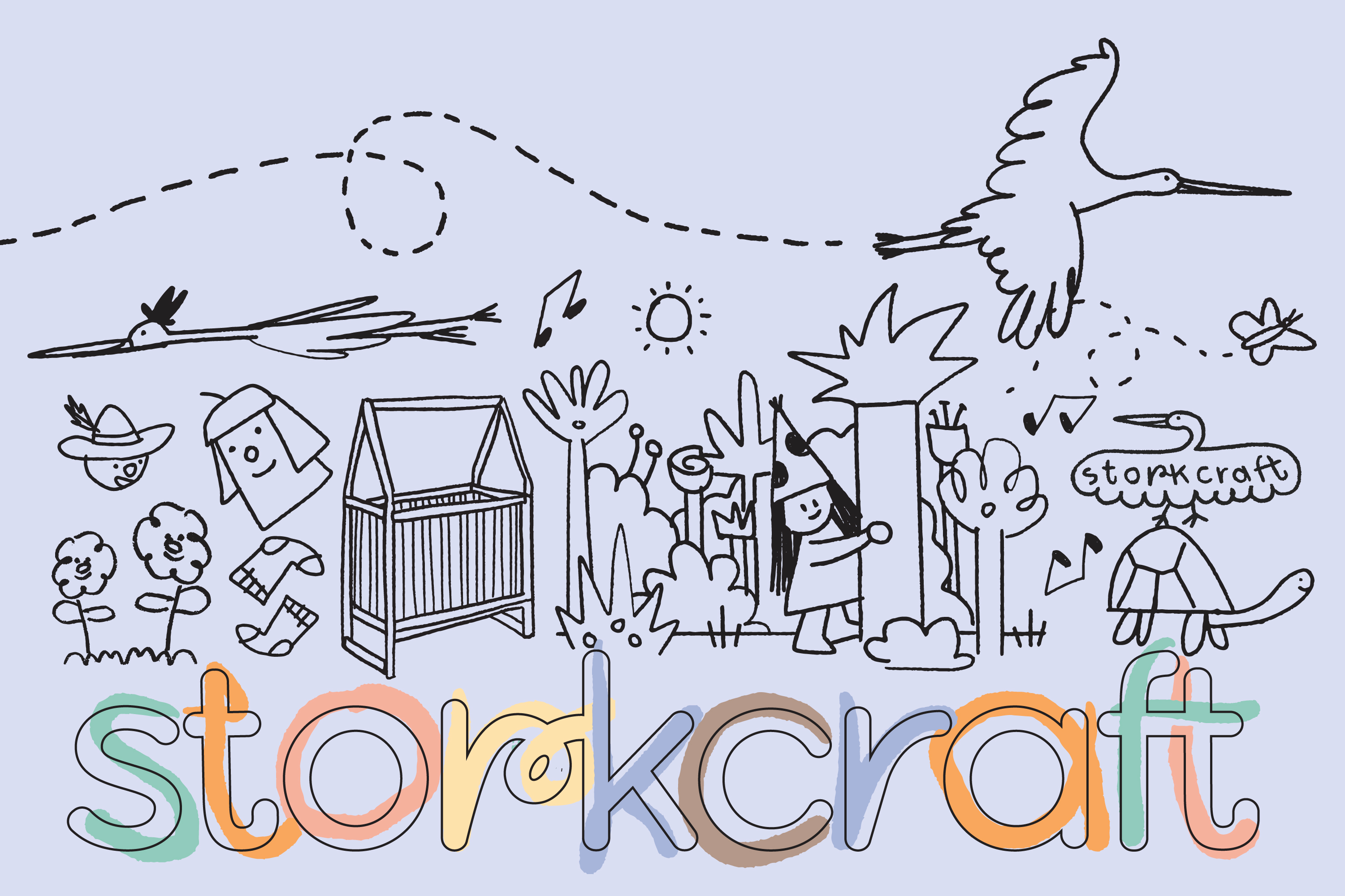 The Storkcraft brand refresh showcases the vibrant and imaginative spirit of childhood. Drawing inspiration from the authenticity of a child’s imagination, the new identity features a playful coloring-book style wordmark and a collection of whimsical, hand-drawn characters. This creative approach invites viewers into a world seen through the eyes of a child, highlighting the brand’s commitment to fun, creativity, and originality.